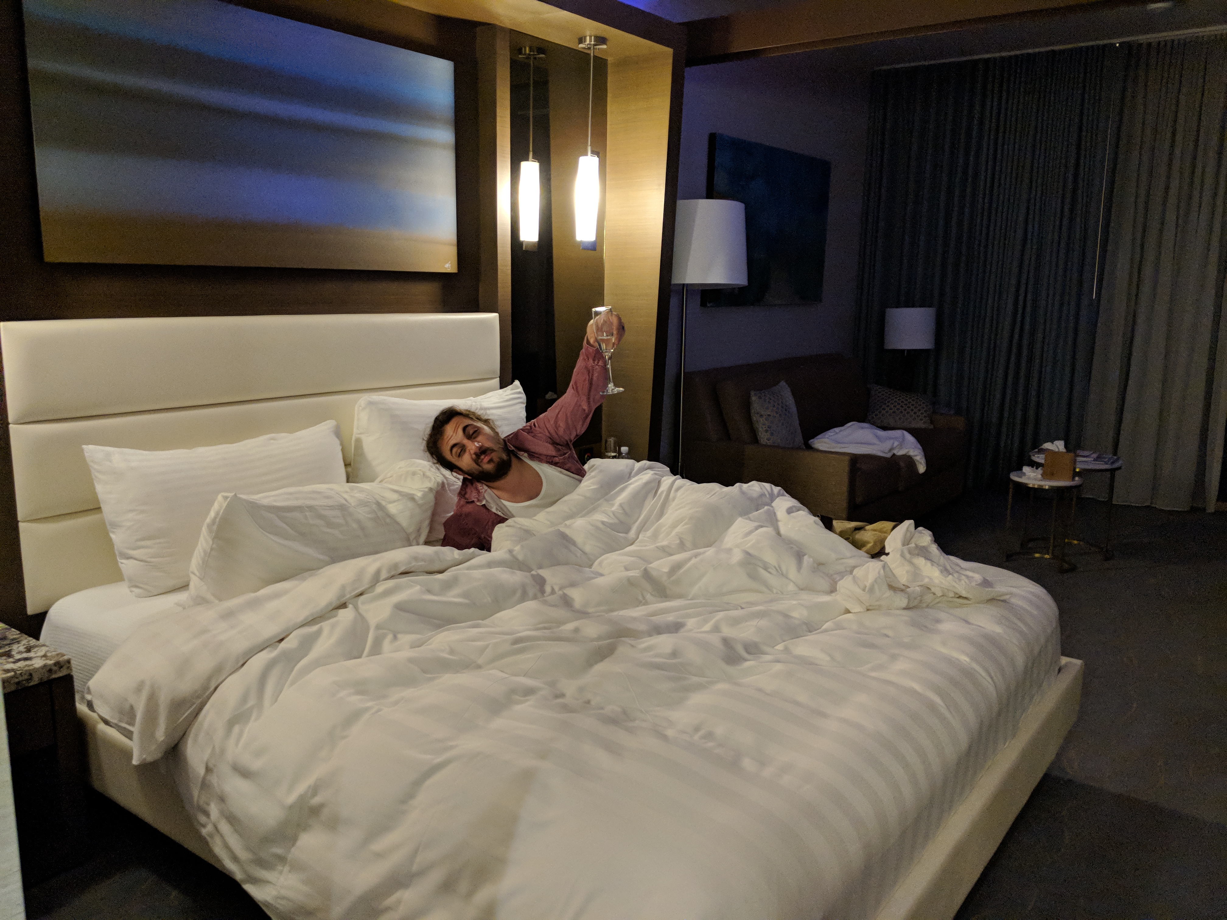 All over the blanket of my cheap hotel bed.